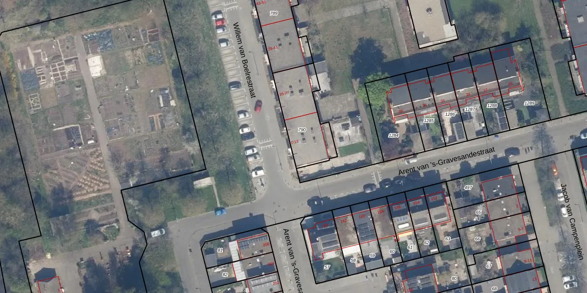 Het perceel waarop Willem van Boelrestraat 13 staat heeft een oppervlakte van 448 m². Dit is een groot perceel. De perceeloppervlakte wordt geregistreerd door het Kadaster. Gedetailleerde informatie over de maten van dit perceel kunt u vinden in het rapport Kadastrale kaart met maatvoering van Willem van Boelrestraat 13.