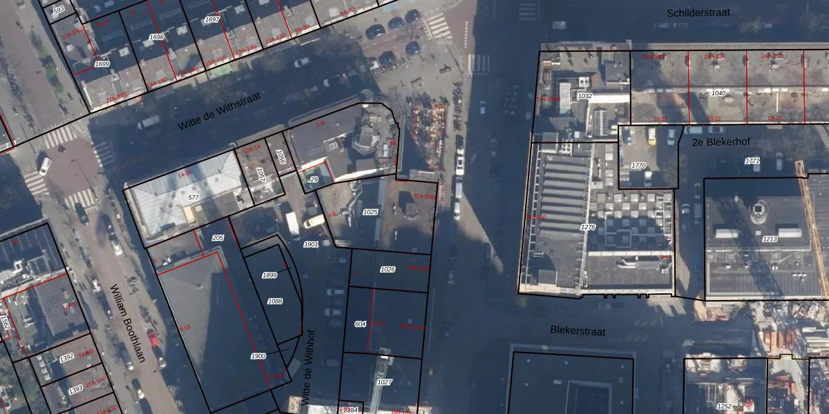 Het perceel waarop Witte de Withhof 6 staat heeft een oppervlakte van 447 m². Dit is een groot perceel. De perceeloppervlakte wordt geregistreerd door het Kadaster. Gedetailleerde informatie over de maten van dit perceel kunt u vinden in het rapport Kadastrale kaart met maatvoering van Witte de Withhof 6.