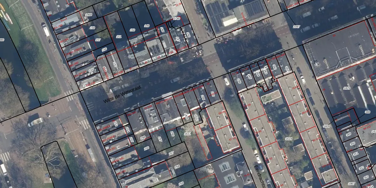 Witte de Withstraat 84-A-01 is gelegen op kadastraal perceel RTD04AG1612. Deze kadastrale aanduiding is uniek en wordt gebruikt door het Kadaster om eigendomsrechten en andere zakelijke rechten vast te leggen. Het perceel maakt onderdeel uit van de kadastrale gemeente Rotterdam.