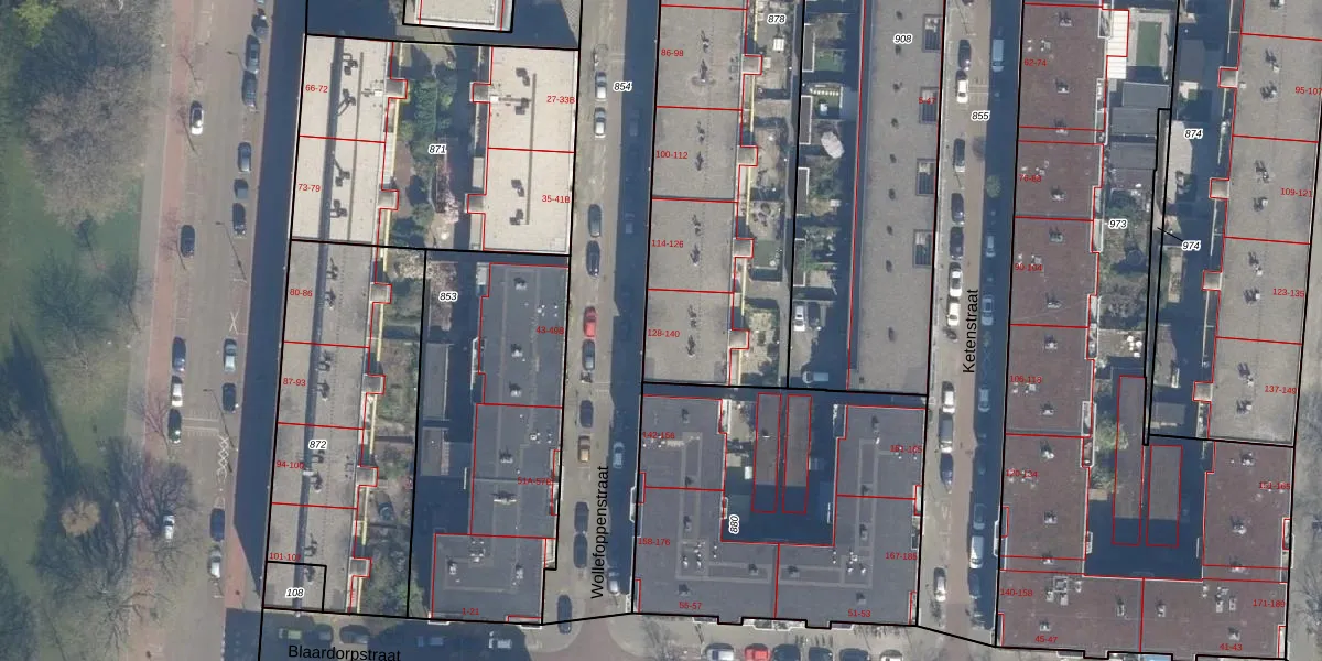 Wollefoppenstraat 128 is gelegen op kadastraal perceel RTD04AE878. Deze kadastrale aanduiding is uniek en wordt gebruikt door het Kadaster om eigendomsrechten en andere zakelijke rechten vast te leggen. Het perceel maakt onderdeel uit van de kadastrale gemeente Rotterdam.