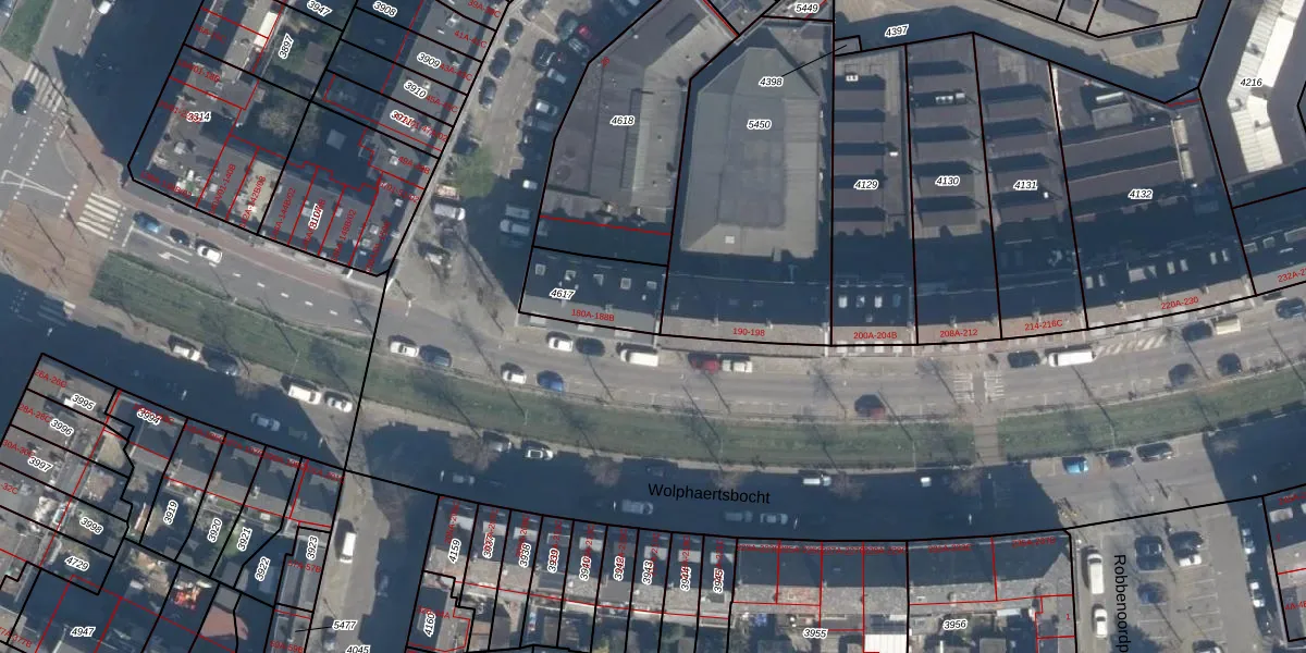 Wolphaertsbocht 188-B is gelegen op kadastraal perceel CLS00E4617. Deze kadastrale aanduiding is uniek en wordt gebruikt door het Kadaster om eigendomsrechten en andere zakelijke rechten vast te leggen. Het perceel maakt onderdeel uit van de kadastrale gemeente Charlois.