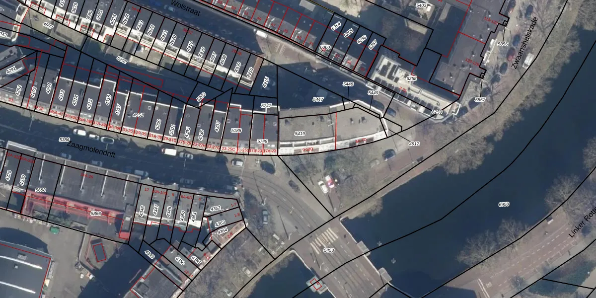 Zaagmolendrift 13-A is gelegen op kadastraal perceel RTD07W5419. Deze kadastrale aanduiding is uniek en wordt gebruikt door het Kadaster om eigendomsrechten en andere zakelijke rechten vast te leggen. Het perceel maakt onderdeel uit van de kadastrale gemeente Rotterdam.