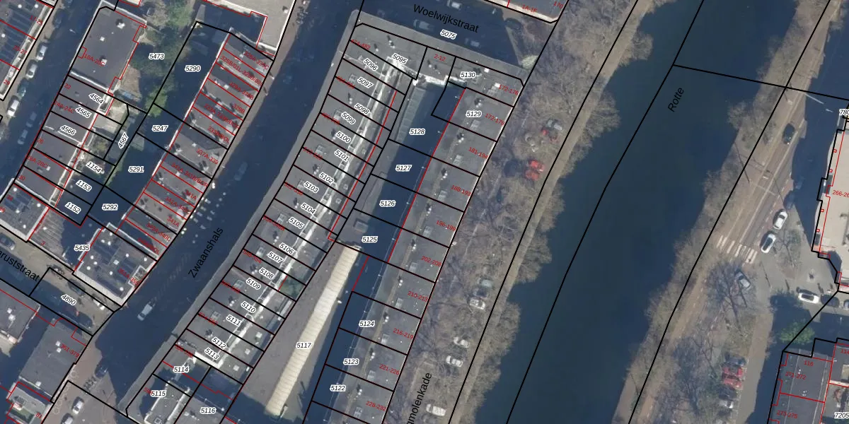 Het perceel waarop het adres ligt is RTD07-W-5126. De afkorting 'RTD07' staat voor kadastrale gemeente Rotterdam. De gemiddelde perceelgrootte in Rotterdam is 506,86 m². Dit perceel is kleiner: de perceeloppervlakte bedraagt 219 m². De grootste perceeloppervlakte in de kadastrale gemeente is 10,8 ha. De kleinste oppervlakte bedraagt 0 m². Op het perceel zijn 4 adressen aanwezig. In de Basisregistratie Kadaster (BRK) werden de grenzen van het perceel geregistreerd op 27-03-2006.