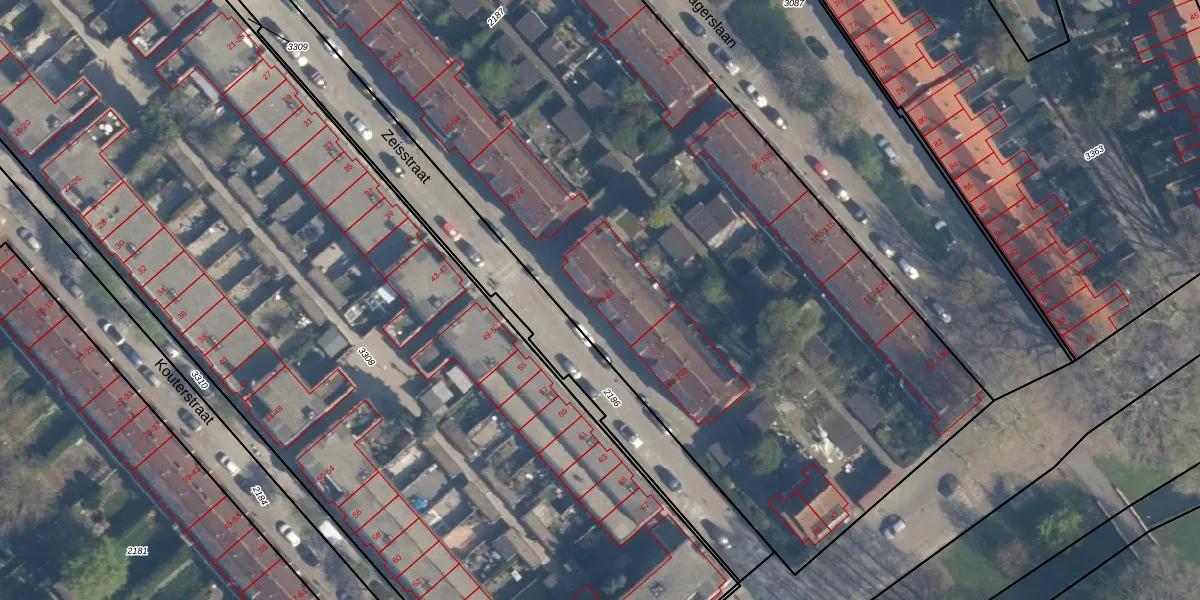 Het perceel waarop Zeisstraat 84 staat heeft een oppervlakte van 8387 m². Dit is een zeer groot perceel. De perceeloppervlakte wordt geregistreerd door het Kadaster. Gedetailleerde informatie over de maten van dit perceel kunt u vinden in het rapport Kadastrale kaart met maatvoering van Zeisstraat 84.