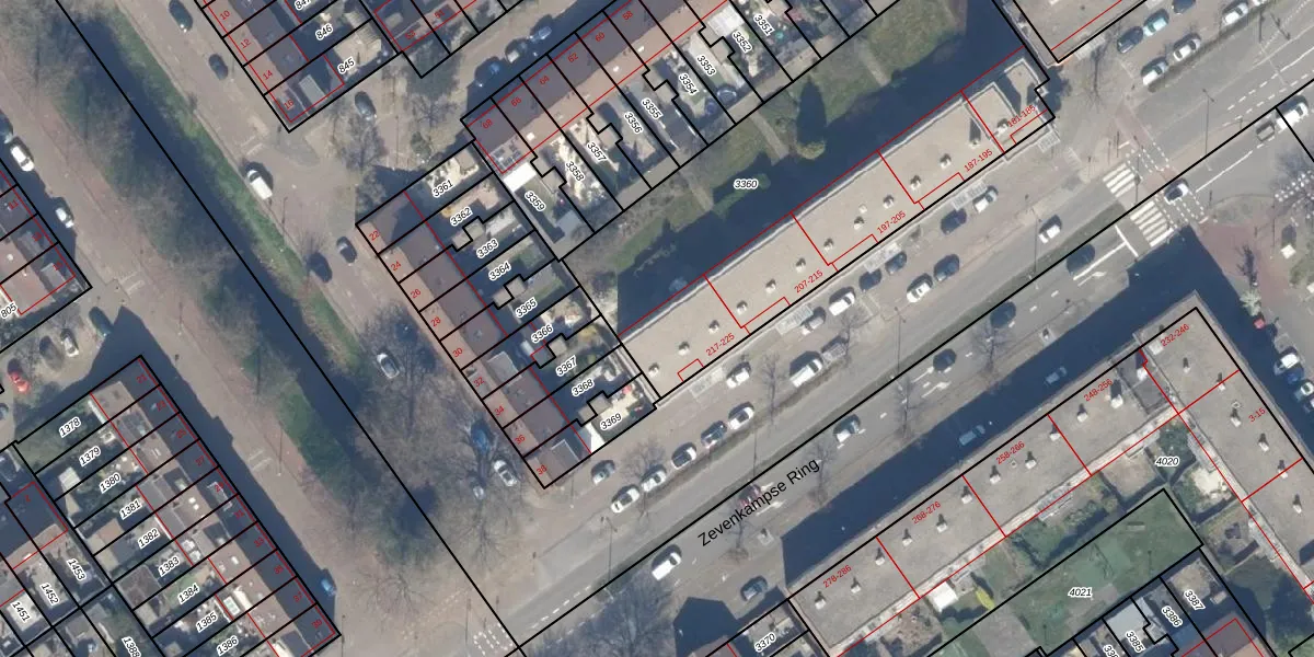 Zevenkampse Ring 217 is gelegen op kadastraal perceel RTD13BA3360. Deze kadastrale aanduiding is uniek en wordt gebruikt door het Kadaster om eigendomsrechten en andere zakelijke rechten vast te leggen. Het perceel maakt onderdeel uit van de kadastrale gemeente Rotterdam.