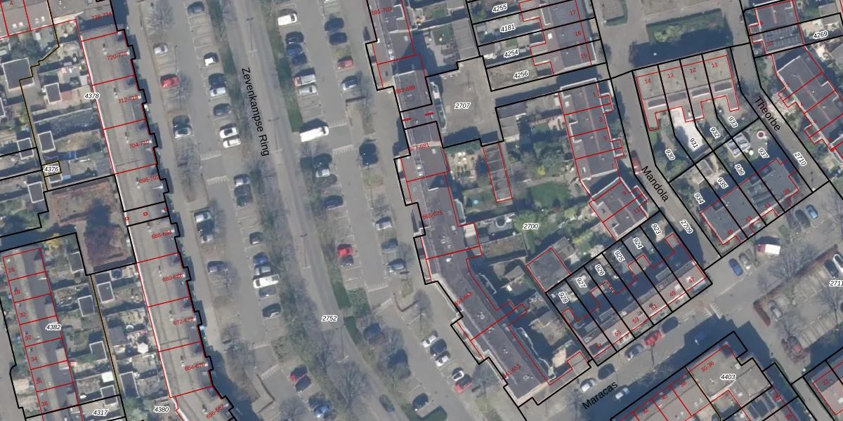 Zevenkampse Ring 671 is gelegen op kadastraal perceel RTD13BA2700. Deze kadastrale aanduiding is uniek en wordt gebruikt door het Kadaster om eigendomsrechten en andere zakelijke rechten vast te leggen. Het perceel maakt onderdeel uit van de kadastrale gemeente Rotterdam.