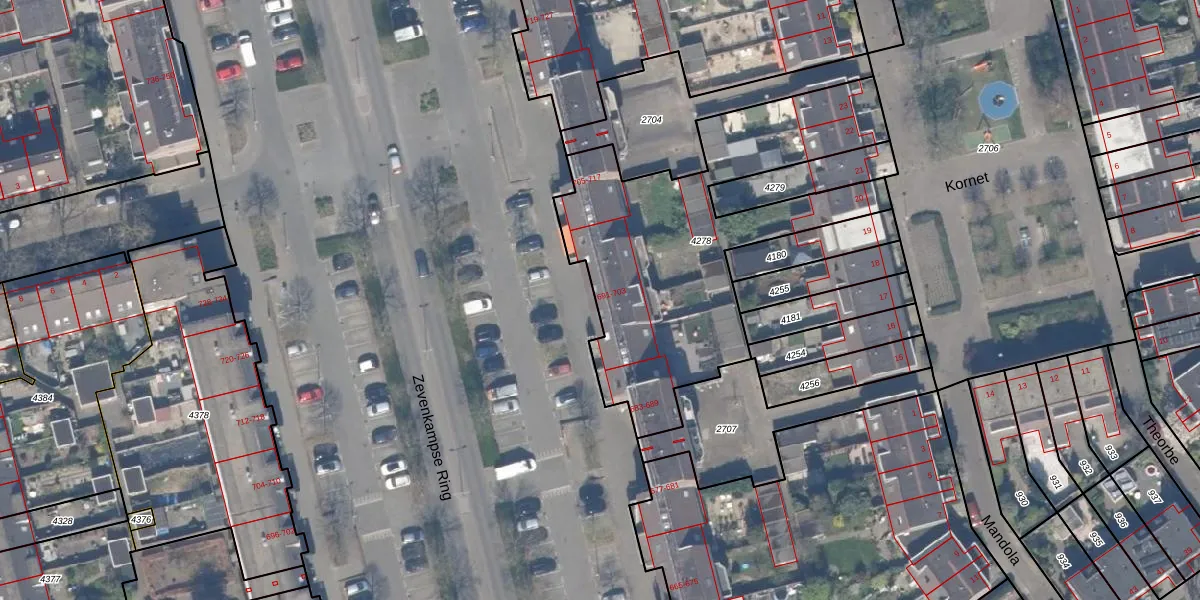 Zevenkampse Ring 697 is gelegen op kadastraal perceel RTD13BA4278. Deze kadastrale aanduiding is uniek en wordt gebruikt door het Kadaster om eigendomsrechten en andere zakelijke rechten vast te leggen. Het perceel maakt onderdeel uit van de kadastrale gemeente Rotterdam.