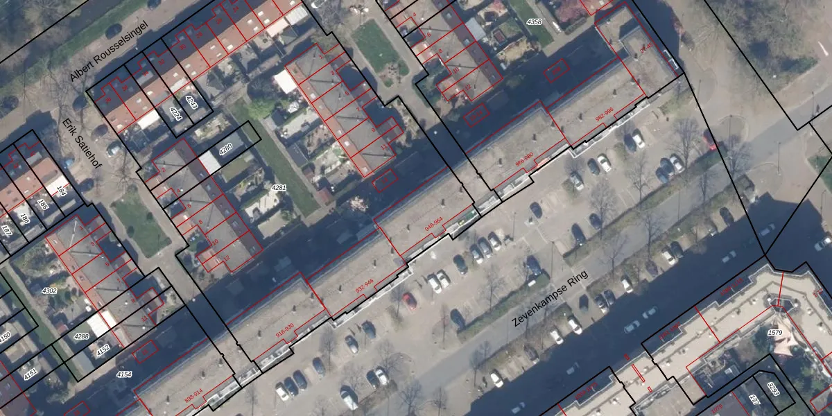 Zevenkampse Ring 950 is gelegen op kadastraal perceel RTD13BA4281. Deze kadastrale aanduiding is uniek en wordt gebruikt door het Kadaster om eigendomsrechten en andere zakelijke rechten vast te leggen. Het perceel maakt onderdeel uit van de kadastrale gemeente Rotterdam.