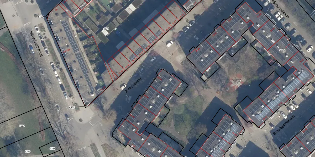 Het perceel waarop Zinkerstraat 52 staat heeft een oppervlakte van 2449 m². Dit is een zeer groot perceel. De perceeloppervlakte wordt geregistreerd door het Kadaster. Gedetailleerde informatie over de maten van dit perceel kunt u vinden in het rapport Kadastrale kaart met maatvoering van Zinkerstraat 52.