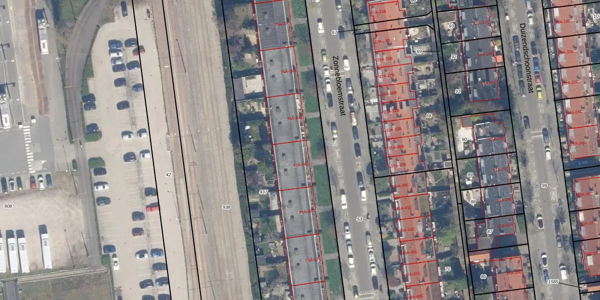 Het perceel waarop Zonnebloemstraat 42-A staat heeft een oppervlakte van 5302 m². Dit is een zeer groot perceel. De perceeloppervlakte wordt geregistreerd door het Kadaster. Gedetailleerde informatie over de maten van dit perceel kunt u vinden in het rapport Kadastrale kaart met maatvoering van Zonnebloemstraat 42-A.