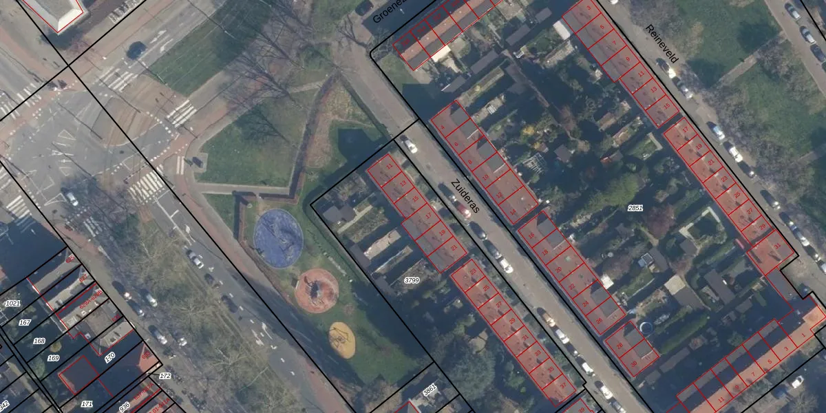 Het perceel waarop Zuideras 15 staat heeft een oppervlakte van 1936 m². Dit is een zeer groot perceel. De perceeloppervlakte wordt geregistreerd door het Kadaster. Gedetailleerde informatie over de maten van dit perceel kunt u vinden in het rapport Kadastrale kaart met maatvoering van Zuideras 15.