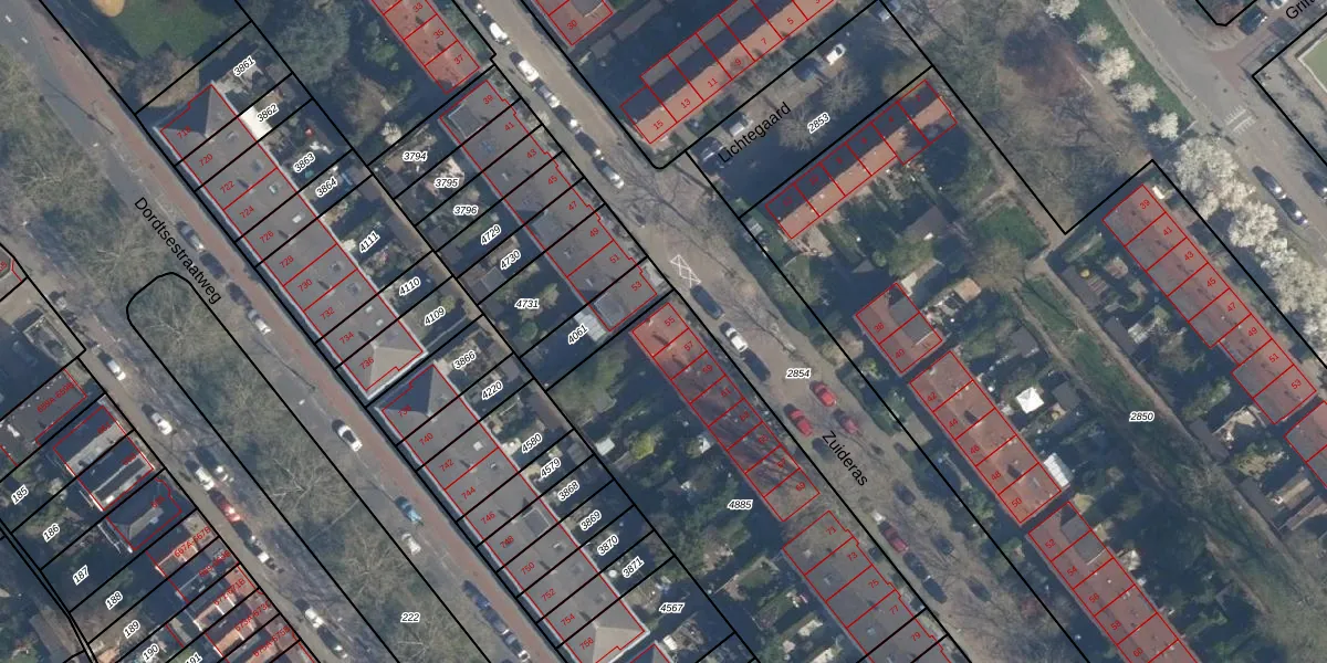 Zuideras 55 is gelegen op kadastraal perceel CLS00F4885. Deze kadastrale aanduiding is uniek en wordt gebruikt door het Kadaster om eigendomsrechten en andere zakelijke rechten vast te leggen. Het perceel maakt onderdeel uit van de kadastrale gemeente Charlois.