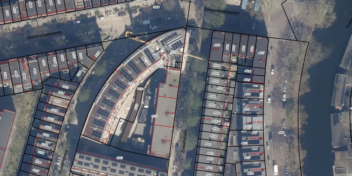 Zwaanshals 13-B is gelegen op kadastraal perceel RTD09Y6115. Deze kadastrale aanduiding is uniek en wordt gebruikt door het Kadaster om eigendomsrechten en andere zakelijke rechten vast te leggen. Het perceel maakt onderdeel uit van de kadastrale gemeente Rotterdam.
