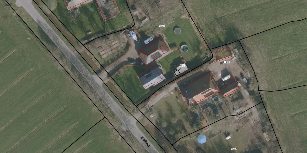 Het perceel waarop Bildwei 66 staat heeft een oppervlakte van 3475 m². Dit is een zeer groot perceel. De perceeloppervlakte wordt geregistreerd door het Kadaster. Gedetailleerde informatie over de maten van dit perceel kunt u vinden in het rapport Kadastrale kaart met maatvoering van Bildwei 66.