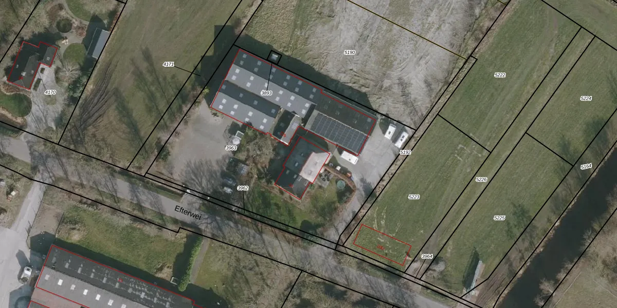 Het perceel waarop Efterwei 22 staat heeft een oppervlakte van 3062 m². Dit is een zeer groot perceel. De perceeloppervlakte wordt geregistreerd door het Kadaster. Gedetailleerde informatie over de maten van dit perceel kunt u vinden in het rapport Kadastrale kaart met maatvoering van Efterwei 22.