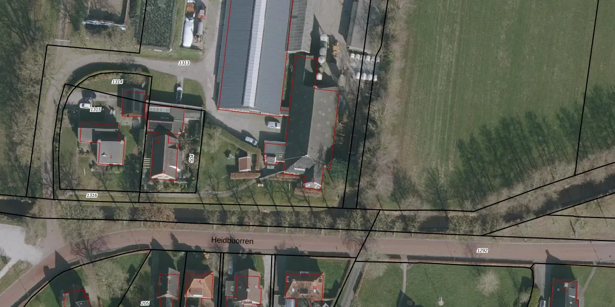 Het perceel waarop Heidbuorren 7 staat heeft een oppervlakte van 1,5 ha. Dit is een zeer groot perceel. De perceeloppervlakte wordt geregistreerd door het Kadaster. Gedetailleerde informatie over de maten van dit perceel kunt u vinden in het rapport Kadastrale kaart met maatvoering van Heidbuorren 7.