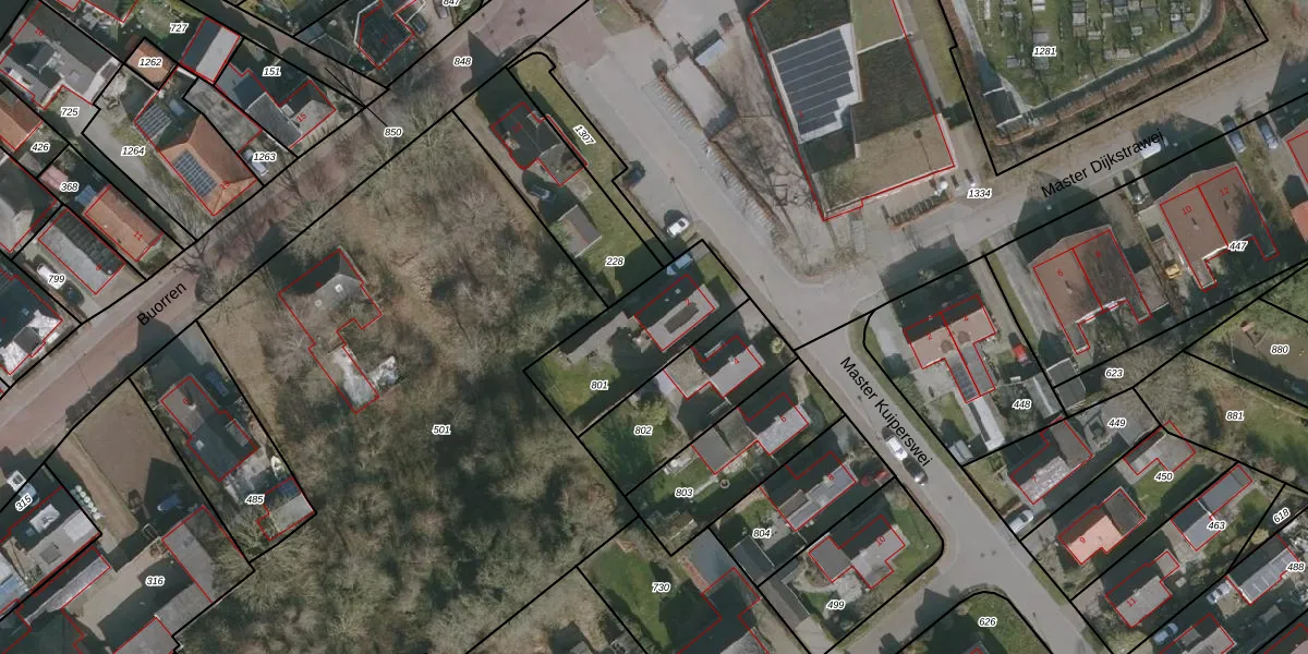 Het perceel waarop Master Kuiperswei 2 staat heeft een oppervlakte van 427 m². Dit is een groot perceel. De perceeloppervlakte wordt geregistreerd door het Kadaster. Gedetailleerde informatie over de maten van dit perceel kunt u vinden in het rapport Kadastrale kaart met maatvoering van Master Kuiperswei 2.