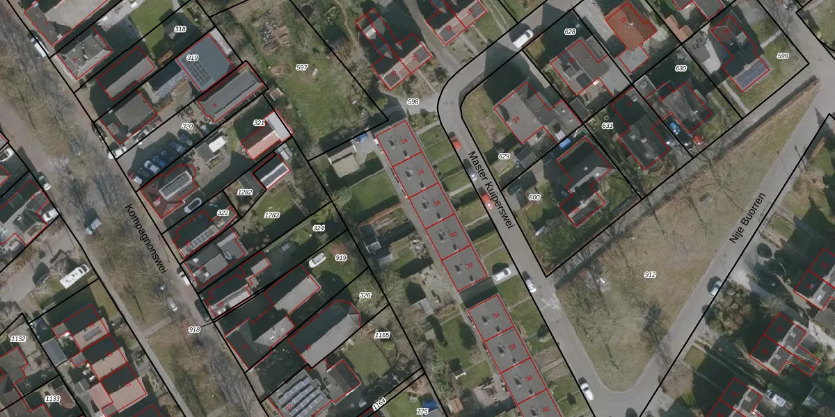 Het perceel waarop Master Kuiperswei 28 staat heeft een oppervlakte van 4180 m². Dit is een zeer groot perceel. De perceeloppervlakte wordt geregistreerd door het Kadaster. Gedetailleerde informatie over de maten van dit perceel kunt u vinden in het rapport Kadastrale kaart met maatvoering van Master Kuiperswei 28.