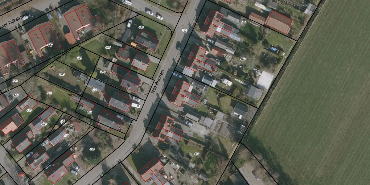 Het perceel waarop Nije Buorren 29 staat heeft een oppervlakte van 3390 m². Dit is een zeer groot perceel. De perceeloppervlakte wordt geregistreerd door het Kadaster. Gedetailleerde informatie over de maten van dit perceel kunt u vinden in het rapport Kadastrale kaart met maatvoering van Nije Buorren 29.