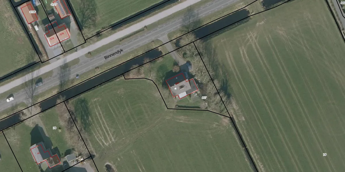 Het perceel waarop Binnendyk 42-a staat heeft een oppervlakte van 1250 m². Dit is een zeer groot perceel. De perceeloppervlakte wordt geregistreerd door het Kadaster. Gedetailleerde informatie over de maten van dit perceel kunt u vinden in het rapport Kadastrale kaart met maatvoering van Binnendyk 42-a.