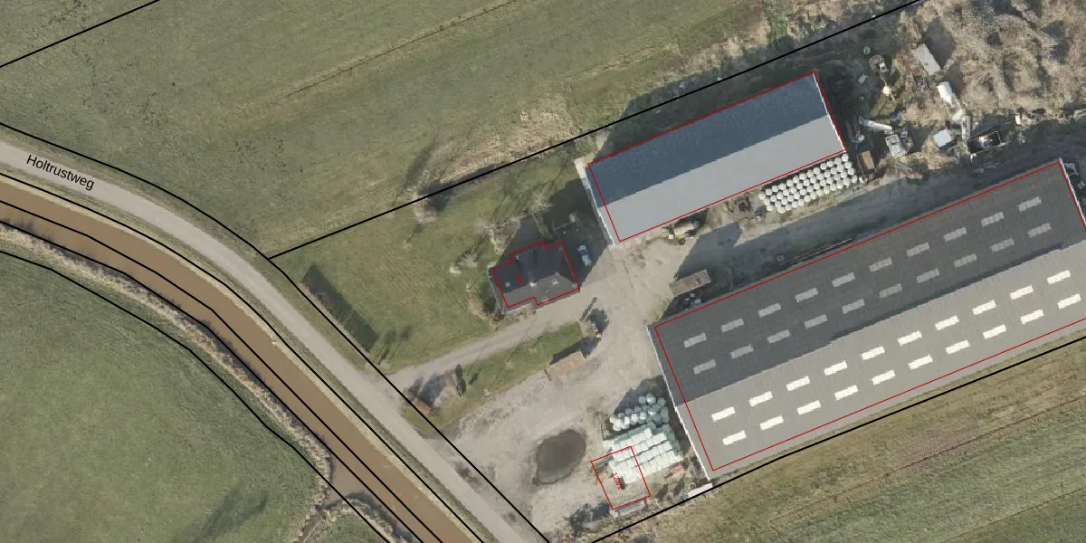 Het perceel waarop Holtrustweg 12-a staat heeft een oppervlakte van 3,9 ha. Dit is een zeer groot perceel. De perceeloppervlakte wordt geregistreerd door het Kadaster. Gedetailleerde informatie over de maten van dit perceel kunt u vinden in het rapport Kadastrale kaart met maatvoering van Holtrustweg 12-a.