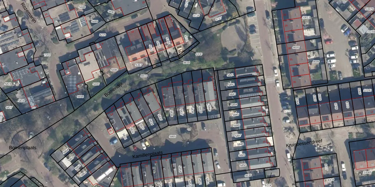 Bomendijk 5 is gelegen op kadastraal perceel RZB00B5838. Deze kadastrale aanduiding is uniek en wordt gebruikt door het Kadaster om eigendomsrechten en andere zakelijke rechten vast te leggen. Het perceel maakt onderdeel uit van de kadastrale gemeente Rozenburg.