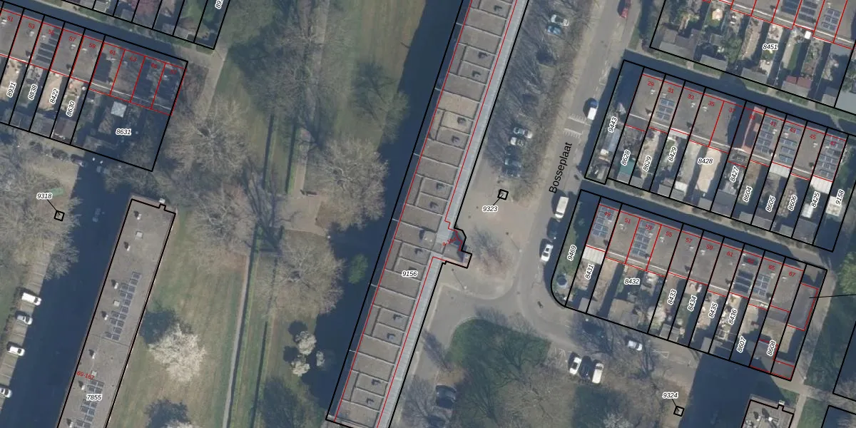 Het perceel waarop Bosseplaat 100 staat heeft een oppervlakte van 1960 m². Dit is een zeer groot perceel. De perceeloppervlakte wordt geregistreerd door het Kadaster. Gedetailleerde informatie over de maten van dit perceel kunt u vinden in het rapport Kadastrale kaart met maatvoering van Bosseplaat 100.