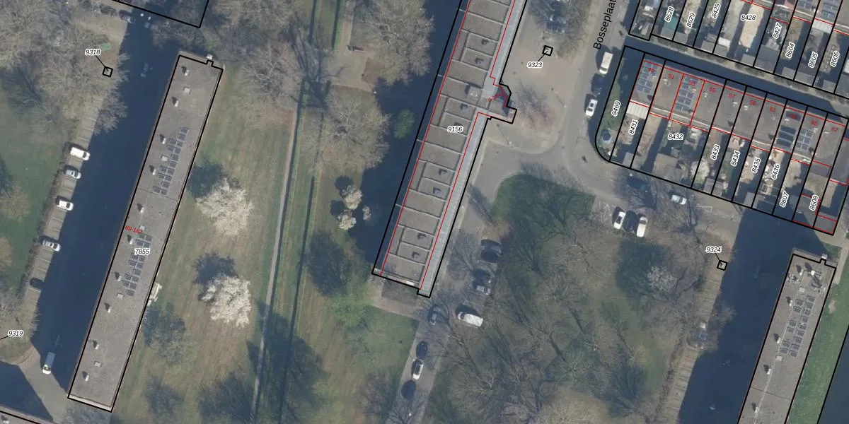 Het perceel waarop Bosseplaat 12 staat heeft een oppervlakte van 1960 m². Dit is een zeer groot perceel. De perceeloppervlakte wordt geregistreerd door het Kadaster. Gedetailleerde informatie over de maten van dit perceel kunt u vinden in het rapport Kadastrale kaart met maatvoering van Bosseplaat 12.