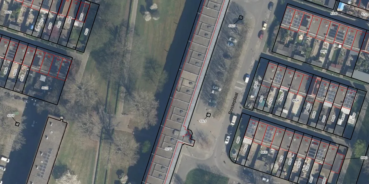 Het perceel waarop Bosseplaat 122 staat heeft een oppervlakte van 1960 m². Dit is een zeer groot perceel. De perceeloppervlakte wordt geregistreerd door het Kadaster. Gedetailleerde informatie over de maten van dit perceel kunt u vinden in het rapport Kadastrale kaart met maatvoering van Bosseplaat 122.