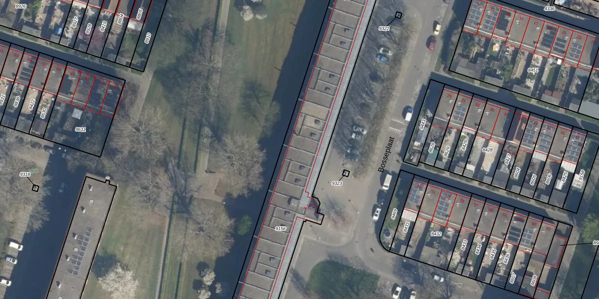 Het perceel waarop Bosseplaat 154 staat heeft een oppervlakte van 1960 m². Dit is een zeer groot perceel. De perceeloppervlakte wordt geregistreerd door het Kadaster. Gedetailleerde informatie over de maten van dit perceel kunt u vinden in het rapport Kadastrale kaart met maatvoering van Bosseplaat 154.