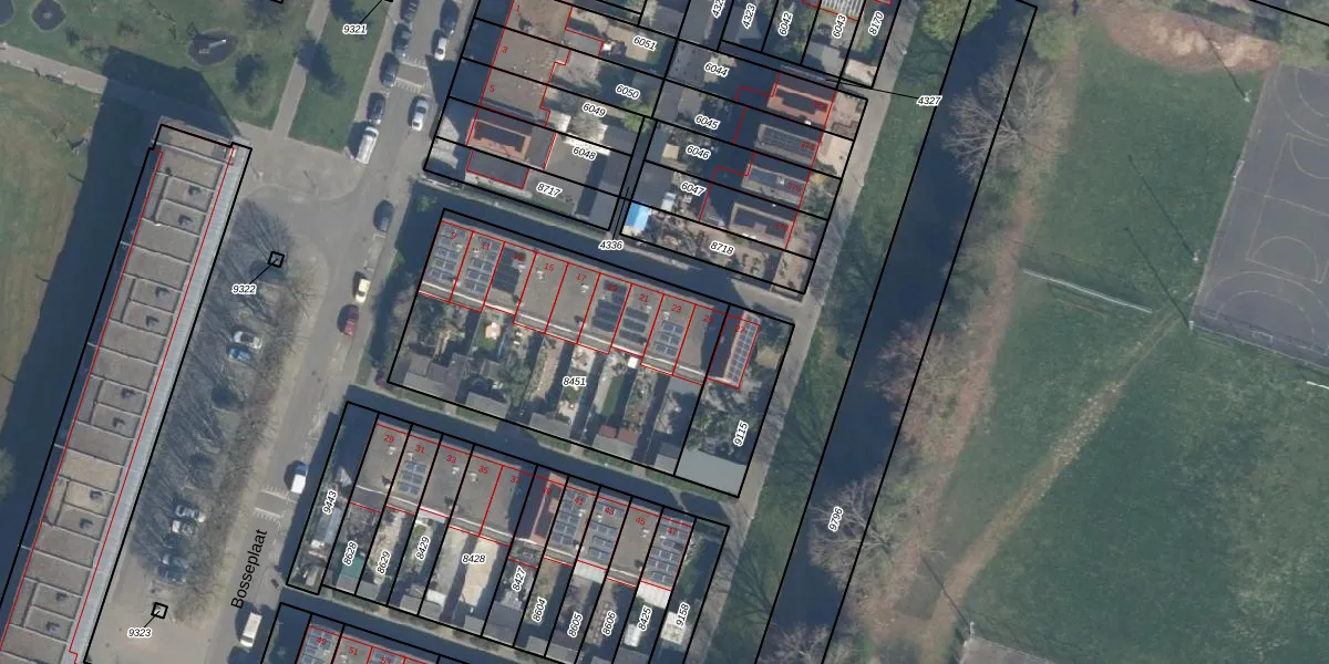 Het perceel waarop Bosseplaat 23 staat heeft een oppervlakte van 1247 m². Dit is een zeer groot perceel. De perceeloppervlakte wordt geregistreerd door het Kadaster. Gedetailleerde informatie over de maten van dit perceel kunt u vinden in het rapport Kadastrale kaart met maatvoering van Bosseplaat 23.