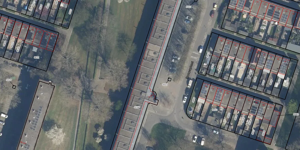 Het perceel waarop Bosseplaat 92 staat heeft een oppervlakte van 1960 m². Dit is een zeer groot perceel. De perceeloppervlakte wordt geregistreerd door het Kadaster. Gedetailleerde informatie over de maten van dit perceel kunt u vinden in het rapport Kadastrale kaart met maatvoering van Bosseplaat 92.