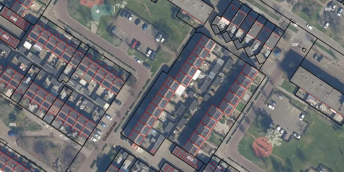 Gruttostraat 18 is gelegen op kadastraal perceel RZB00B5277. Deze kadastrale aanduiding is uniek en wordt gebruikt door het Kadaster om eigendomsrechten en andere zakelijke rechten vast te leggen. Het perceel maakt onderdeel uit van de kadastrale gemeente Rozenburg.