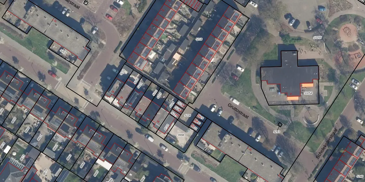 Het perceel waarop Gruttostraat 35 staat heeft een oppervlakte van 2480 m². Dit is een zeer groot perceel. De perceeloppervlakte wordt geregistreerd door het Kadaster. Gedetailleerde informatie over de maten van dit perceel kunt u vinden in het rapport Kadastrale kaart met maatvoering van Gruttostraat 35.