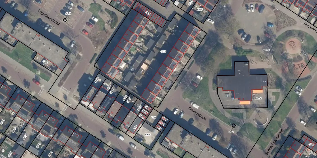 Het perceel waarop Gruttostraat 39 staat heeft een oppervlakte van 2480 m². Dit is een zeer groot perceel. De perceeloppervlakte wordt geregistreerd door het Kadaster. Gedetailleerde informatie over de maten van dit perceel kunt u vinden in het rapport Kadastrale kaart met maatvoering van Gruttostraat 39.