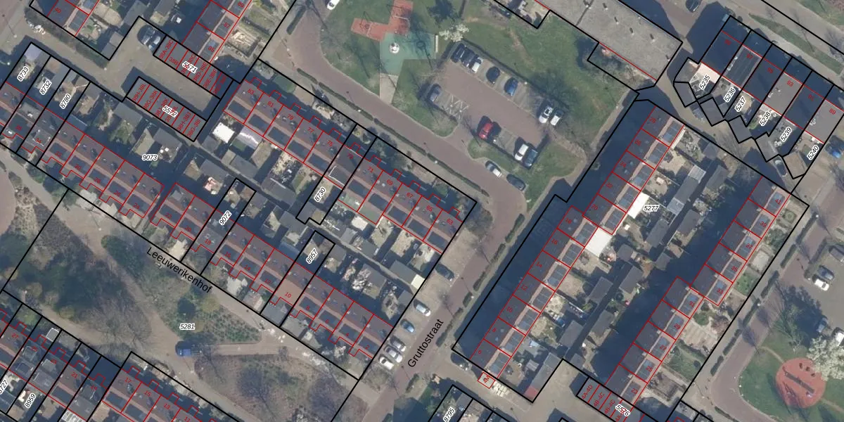 Gruttostraat 65 is gelegen op kadastraal perceel RZB00B9073. Deze kadastrale aanduiding is uniek en wordt gebruikt door het Kadaster om eigendomsrechten en andere zakelijke rechten vast te leggen. Het perceel maakt onderdeel uit van de kadastrale gemeente Rozenburg.