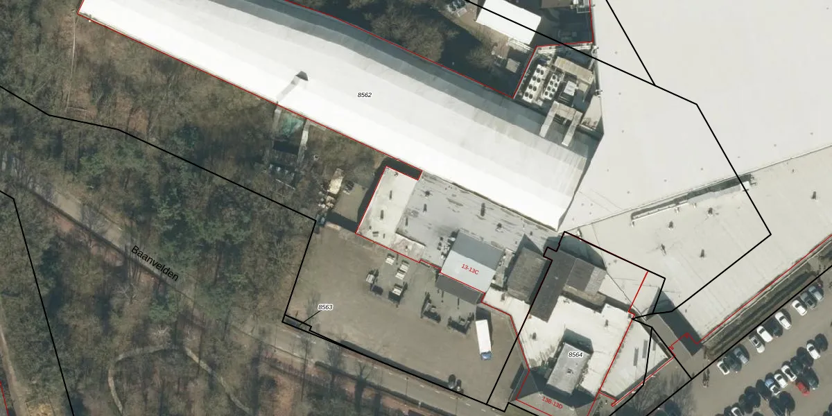 Het perceel waarop Baanvelden 13-A staat heeft een oppervlakte van 1,2 ha. Dit is een zeer groot perceel. De perceeloppervlakte wordt geregistreerd door het Kadaster. Gedetailleerde informatie over de maten van dit perceel kunt u vinden in het rapport Kadastrale kaart met maatvoering van Baanvelden 13-A.