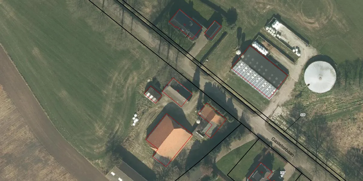 Het perceel waarop Gastelsebaan 12 staat heeft een oppervlakte van 3,3 ha. Dit is een zeer groot perceel. De perceeloppervlakte wordt geregistreerd door het Kadaster. Gedetailleerde informatie over de maten van dit perceel kunt u vinden in het rapport Kadastrale kaart met maatvoering van Gastelsebaan 12.