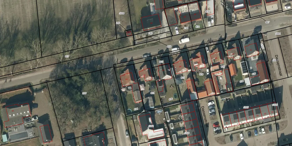 Het adres is gelegen op perceel 821 in de sectie P en de kadastrale gemeente Rucphen. De kadastrale aanduiding is aldus RPN00-P-821. Het perceel is kleiner dan gemiddeld in Rucphen. Het perceel is 417 m² groot, terwijl het gemiddelde ligt op 4095,22 m². Het kleinste perceel in de kadastrale gemeente is 0 m² groot. De grootste perceeloppervlakte is 43,3 ha. Er zijn geen andere adressen aanwezig op het perceel. De huidige grenzen van het perceel zijn digitaal in de Basisregistratie Kadaster (BRK) geregistreerd op 02-09-2009.
