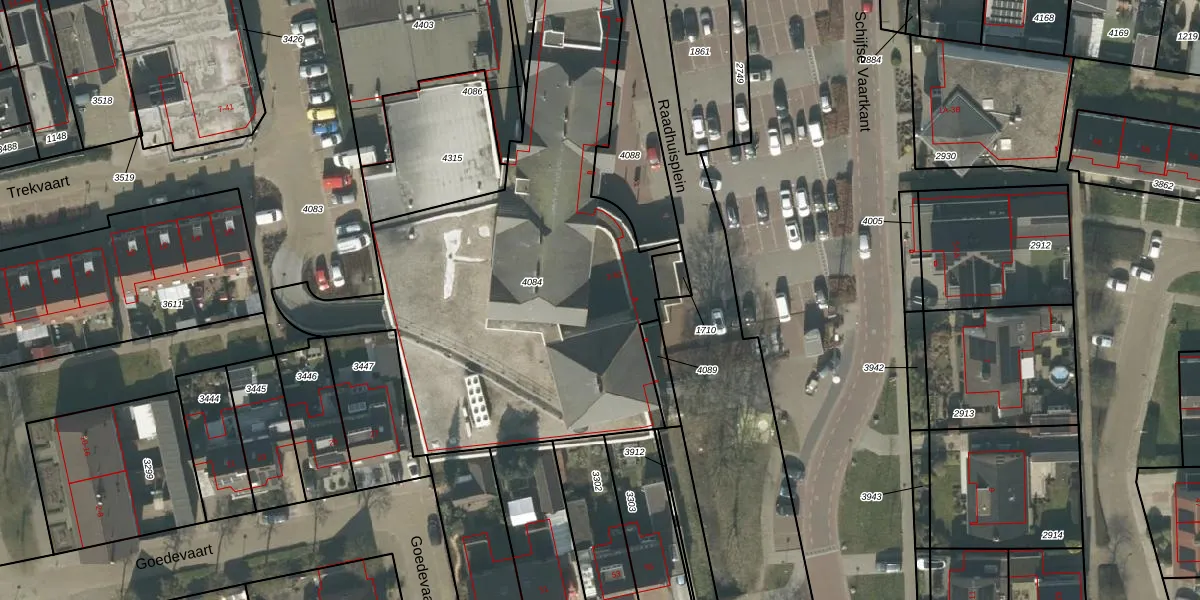 Het perceel waarop Raadhuisplein 4 staat heeft een oppervlakte van 2724 m². Dit is een zeer groot perceel. De perceeloppervlakte wordt geregistreerd door het Kadaster. Gedetailleerde informatie over de maten van dit perceel kunt u vinden in het rapport Kadastrale kaart met maatvoering van Raadhuisplein 4.