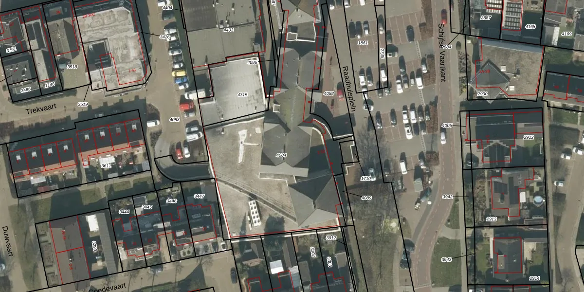 Het perceel waarop Raadhuisplein 40 staat heeft een oppervlakte van 2724 m². Dit is een zeer groot perceel. De perceeloppervlakte wordt geregistreerd door het Kadaster. Gedetailleerde informatie over de maten van dit perceel kunt u vinden in het rapport Kadastrale kaart met maatvoering van Raadhuisplein 40.