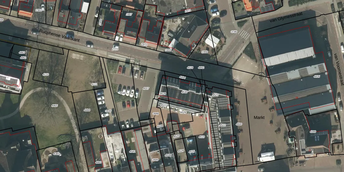 Het adres is gelegen op perceel 4530 in de sectie C en de kadastrale gemeente Rucphen. De kadastrale aanduiding is aldus RPN00-C-4530. De gemiddelde perceelgrootte in Rucphen is 4091,58 m². Dit perceel is kleiner: de perceeloppervlakte bedraagt 292 m². Het grootste perceel in de kadastrale gemeente is 43,3 ha. Het kleinste perceel heeft een oppervlakte van 0 m². Op het perceel zijn 12 adressen aanwezig. In de Basisregistratie Kadaster (BRK) werden de grenzen van het perceel geregistreerd op 19-08-2022.