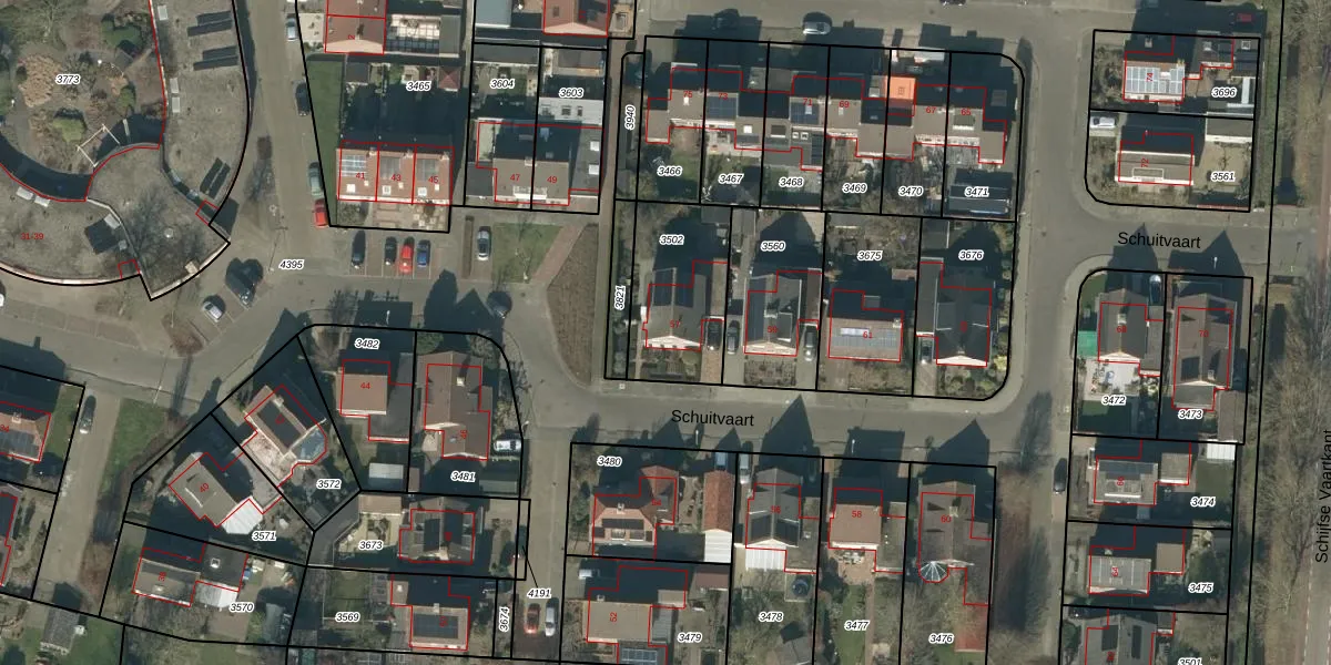 Het perceel waarop Schuitvaart 57 staat heeft een oppervlakte van 385 m². Dit is een groot perceel. De perceeloppervlakte wordt geregistreerd door het Kadaster. Gedetailleerde informatie over de maten van dit perceel kunt u vinden in het rapport Kadastrale kaart met maatvoering van Schuitvaart 57.