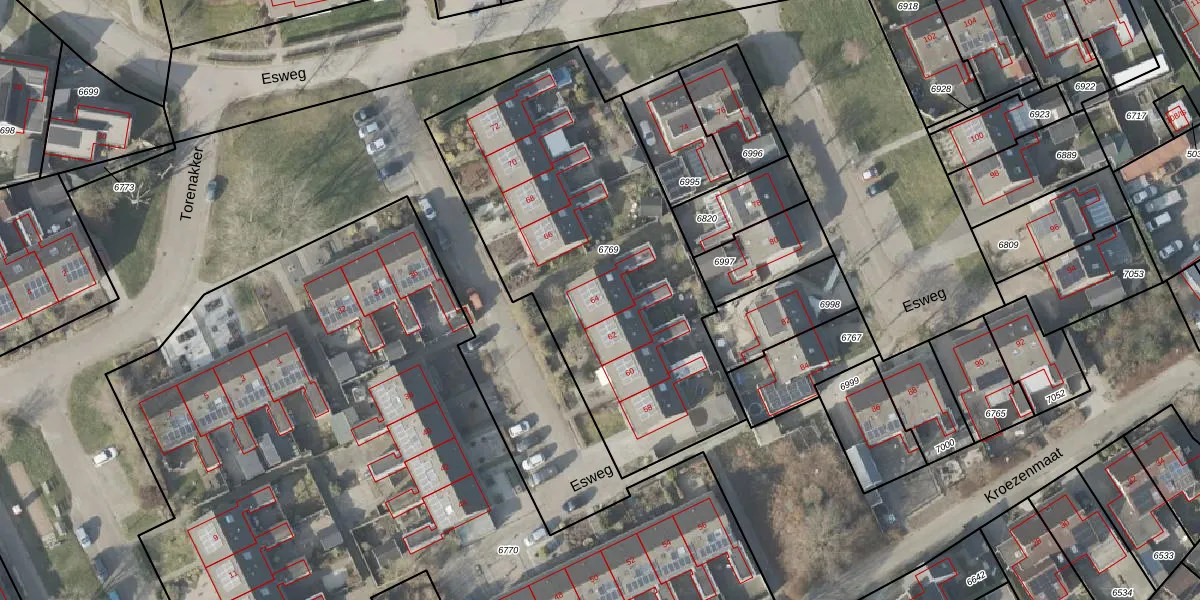 Het perceel waarop Esweg 64 staat heeft een oppervlakte van 1875 m². Dit is een zeer groot perceel. De perceeloppervlakte wordt geregistreerd door het Kadaster. Gedetailleerde informatie over de maten van dit perceel kunt u vinden in het rapport Kadastrale kaart met maatvoering van Esweg 64.