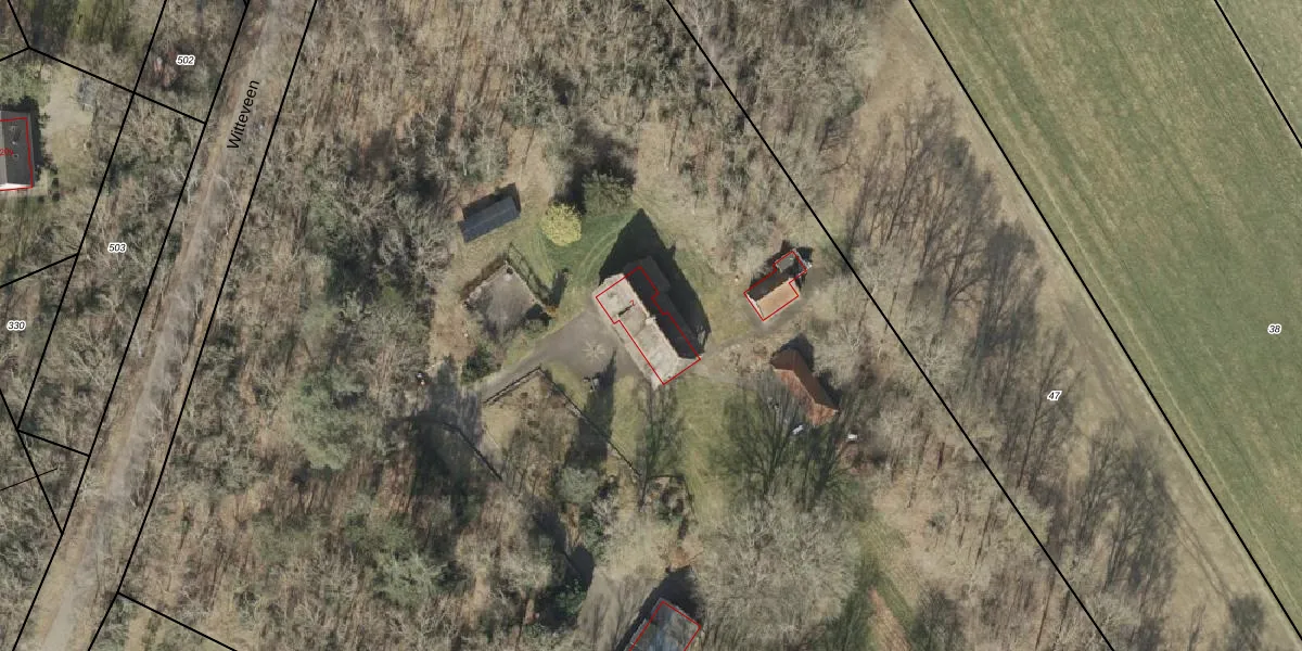 Het perceel waarop Witteveen 7 staat heeft een oppervlakte van 2,0 ha. Dit is een zeer groot perceel. De perceeloppervlakte wordt geregistreerd door het Kadaster. Gedetailleerde informatie over de maten van dit perceel kunt u vinden in het rapport Kadastrale kaart met maatvoering van Witteveen 7.