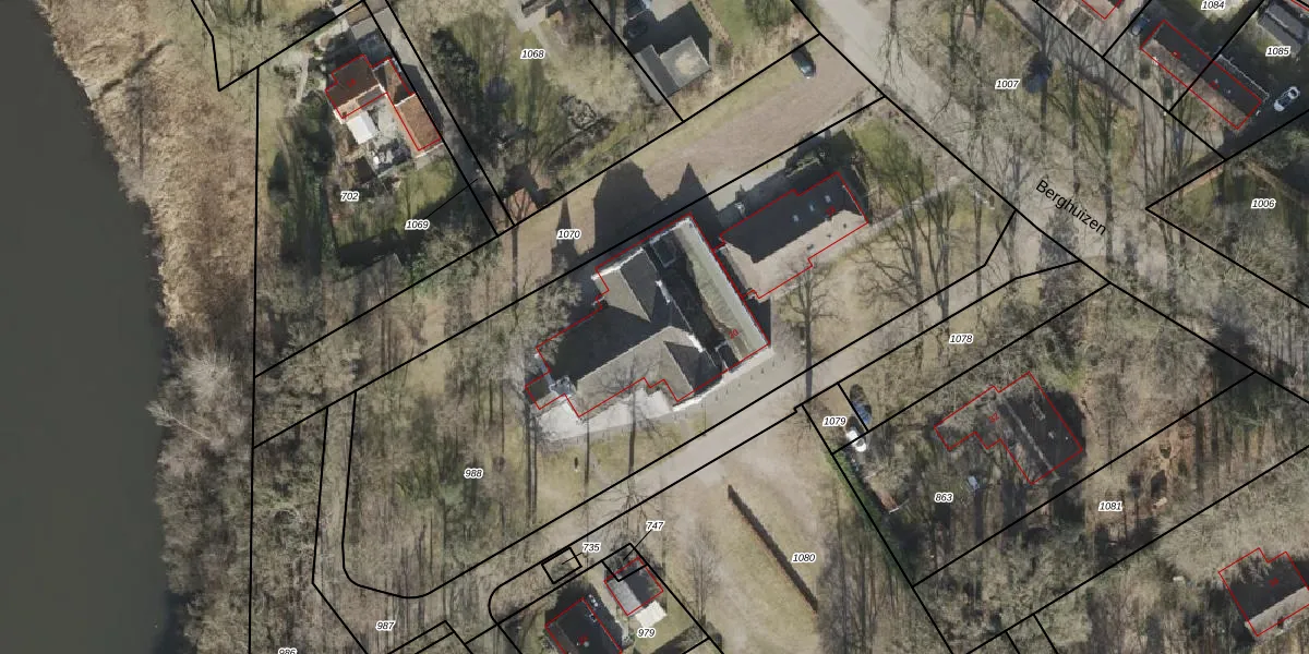 Het perceel waarop Berghuizen 20 staat heeft een oppervlakte van 3323 m². Dit is een zeer groot perceel. De perceeloppervlakte wordt geregistreerd door het Kadaster. Gedetailleerde informatie over de maten van dit perceel kunt u vinden in het rapport Kadastrale kaart met maatvoering van Berghuizen 20.