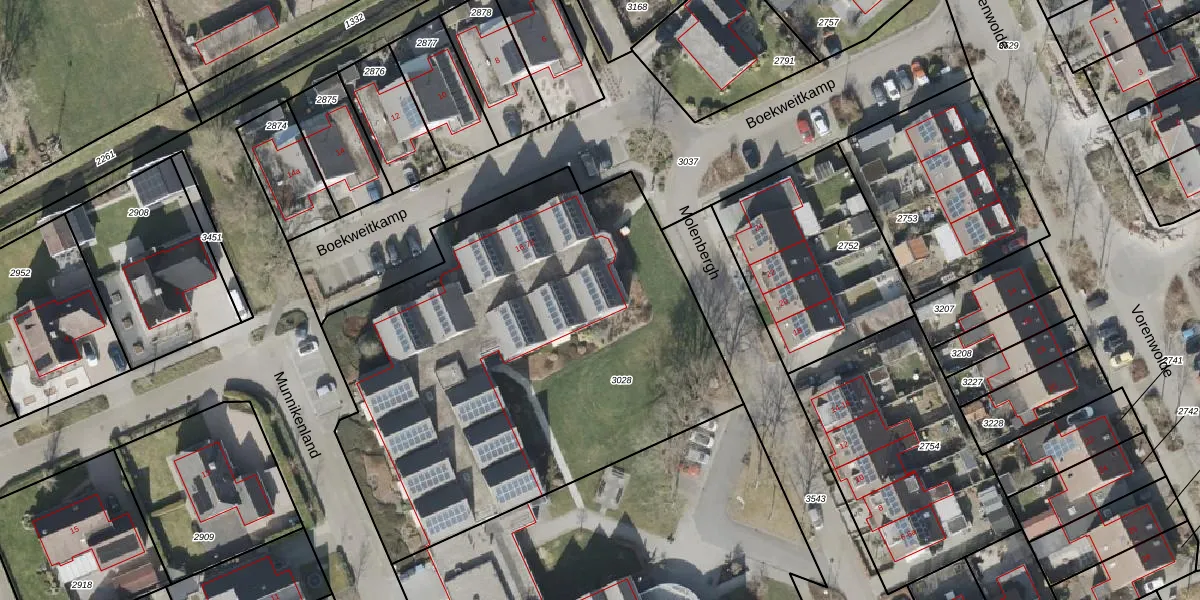 Het perceel waarop Boekweitkamp 66 staat heeft een oppervlakte van 2777 m². Dit is een zeer groot perceel. De perceeloppervlakte wordt geregistreerd door het Kadaster. Gedetailleerde informatie over de maten van dit perceel kunt u vinden in het rapport Kadastrale kaart met maatvoering van Boekweitkamp 66.