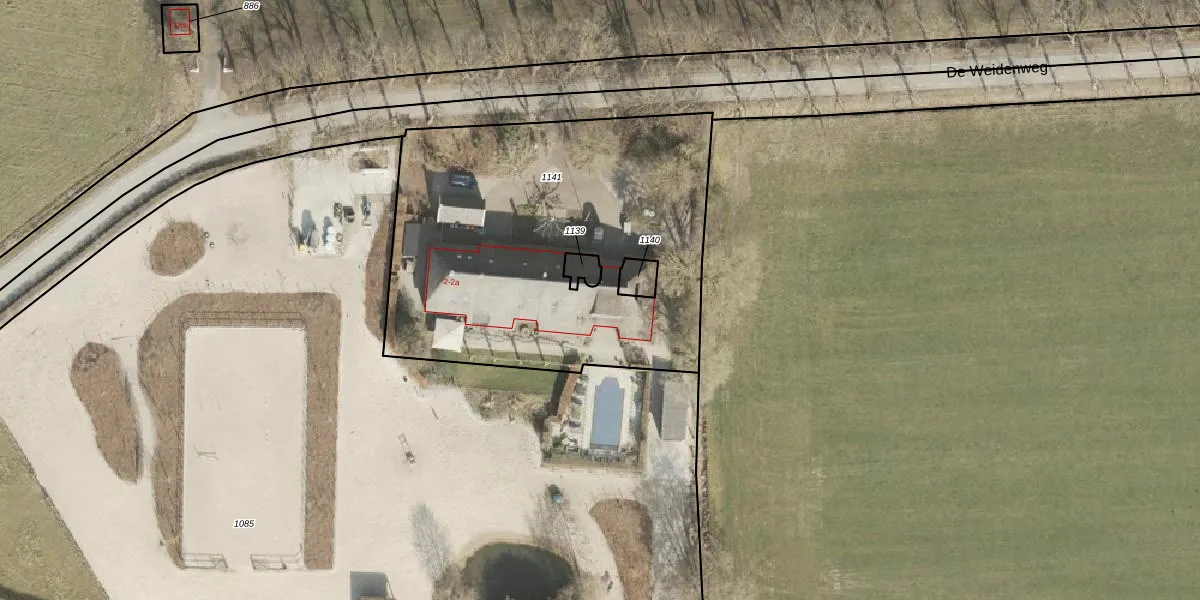 Het perceel waarop De Weidenweg 2-a staat heeft een oppervlakte van 2049 m². Dit is een zeer groot perceel. De perceeloppervlakte wordt geregistreerd door het Kadaster. Gedetailleerde informatie over de maten van dit perceel kunt u vinden in het rapport Kadastrale kaart met maatvoering van De Weidenweg 2-a.