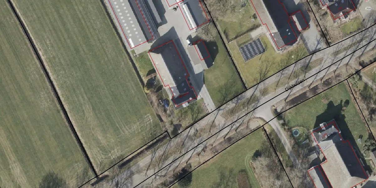 Het perceel waarop Dijkhuizen 117-a staat heeft een oppervlakte van 7,0 ha. Dit is een zeer groot perceel. De perceeloppervlakte wordt geregistreerd door het Kadaster. Gedetailleerde informatie over de maten van dit perceel kunt u vinden in het rapport Kadastrale kaart met maatvoering van Dijkhuizen 117-a.