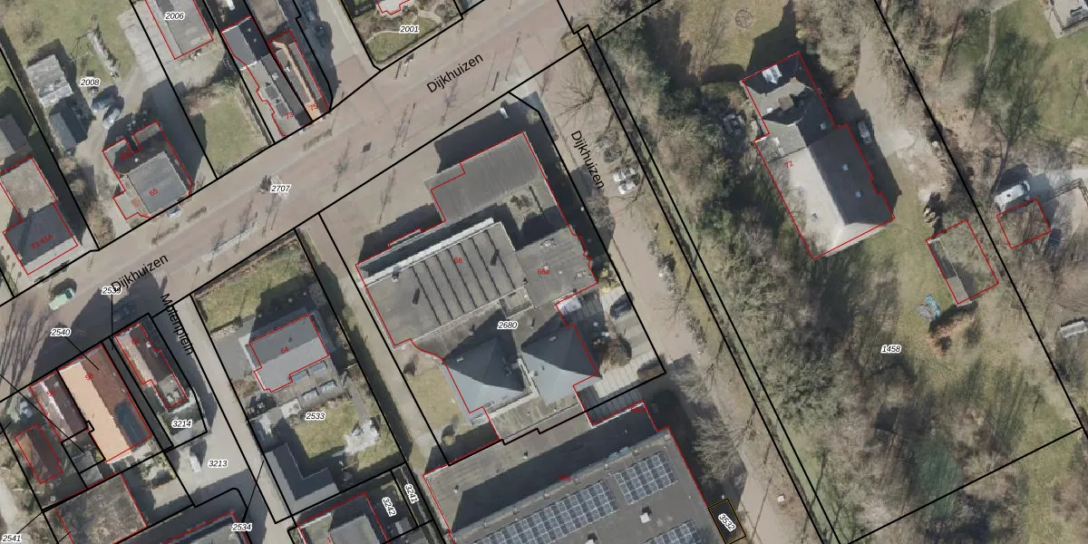 Het perceel waarop Dijkhuizen 66-a staat heeft een oppervlakte van 2422 m². Dit is een zeer groot perceel. De perceeloppervlakte wordt geregistreerd door het Kadaster. Gedetailleerde informatie over de maten van dit perceel kunt u vinden in het rapport Kadastrale kaart met maatvoering van Dijkhuizen 66-a.